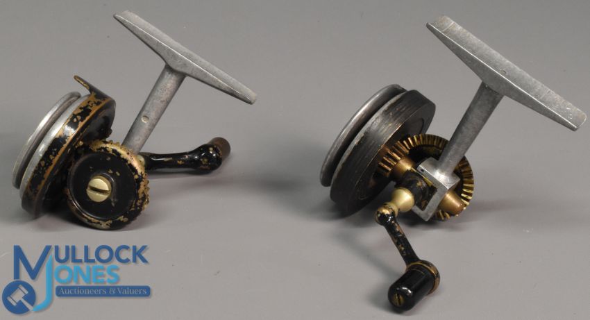 2x A Allan Ltd Glasgow patent 'Spinet' threadline casting reels number 262706, in brass and alloy, right and left hand wind examples, manual pickup, one missing bail pin, exposed gearing, o/w appear in good overall condition