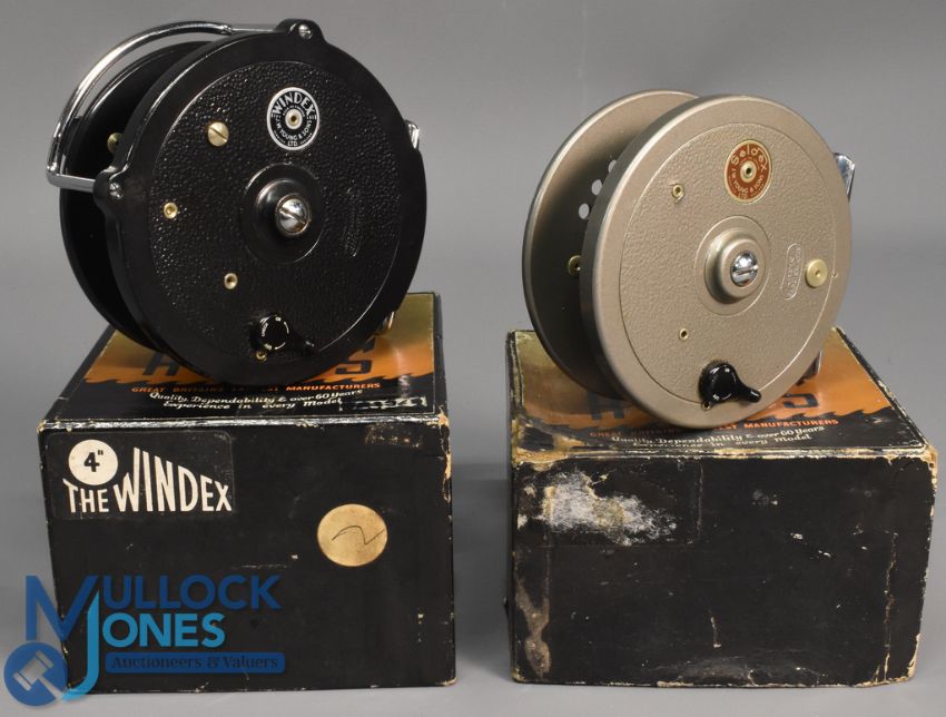 2x JW Young & Sons Reels - incl a 4" Windex centrepin reel twin handle, line guide, central tensioner, on/off check, t/w a 3 ¾" Seldex centrepin reel twin handle, on/off check, mottled finish - appear in generally clean and tidy condition, with maker's card boxes