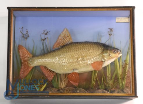 Cased Fish - Preserved Roach mounted in a glazed flat front case - gilt slip, 19"x13"x6", 15 1/2" long specimen, mounted against blue/green graduated backboard, over gravel/reeds, internal paper label reads "Caught in the Avon at Ringwood 5th. March 1934, weight 2lbs 5oz"