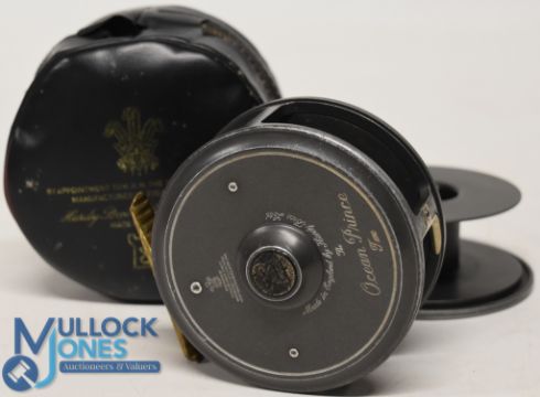 Hardy "The Ocean Prince" Two saltwater geared fly reel. 3-3/4" dia. Crank arm, reversible U shaped line guide, turns well with check click, Comes with spare spool spare check spring and Hardy zip case