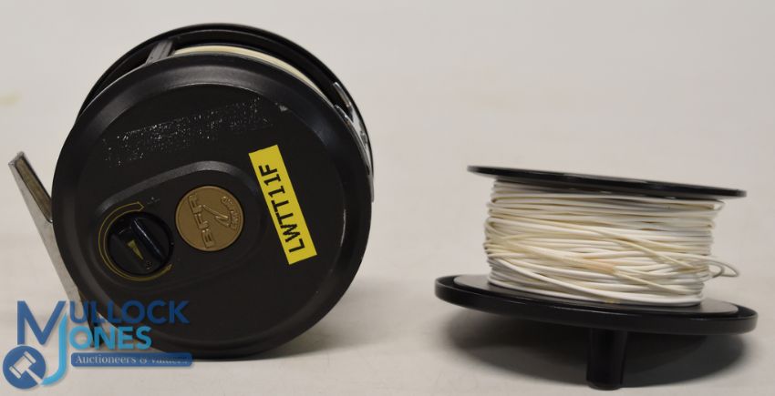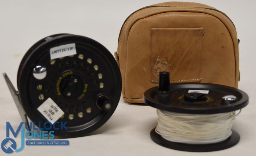BFR England Magnum 200D Disc Drag alloy salmon fly reel and spare spool, 4" wide ventilated spool, 2 screw latch, counter balanced handle, rear tensioner, constant check, leather zip case. Very light use, runs well