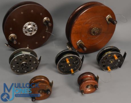 Various Reels (7) features a large 10" sea fishing reel in wood with twin handles, another 10" Bakelite Sea fishing reel twin handle, 2x WR Products Speedia 4" centrepin reels, a 4 ½" Avon Crown Centre pin reel (no handles), t/w 2x small wood and brass reels 2 ¾" and 3" examples - condition mixed - box