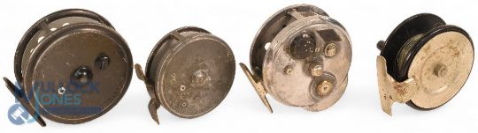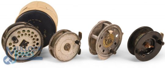 Hardy Bros "The Viscount 150" alloy light salmon fly reel - 3 7/8" ventilated spool, 2 screw castle latch, black handle, rear tensioner, constant check, signs of wear. MZC. Hardy Bros "The Hydra" alloy trout fly reel - 3 1/8" solid spool, 2 screw latch, black handle, constant check, signs of use. Rusmor Popular, product retailed by M Lee & Son Redditch - 3 1/4" centre pin reel, twin handles, wing nut spindle tensioner, alloy and Bakelite - needs a service. MCL alloy trout fly reel - 3 1/2" ventilated spool, 3 screw latch, twin handles (one broken), rear tensioner, on/off check, line guide, filed foot. (4)