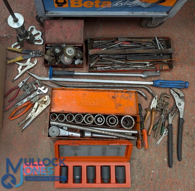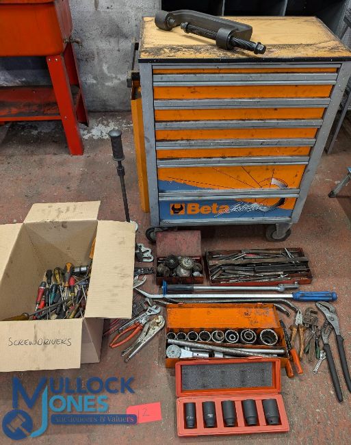 Beta Action Tool chest trolley and various tools - includes various punches, scribes, wire drill bits, socket sets, Palmera large socket set, crow bars, grips, pliers, screwdrivers etc - see image 1x toolbox
