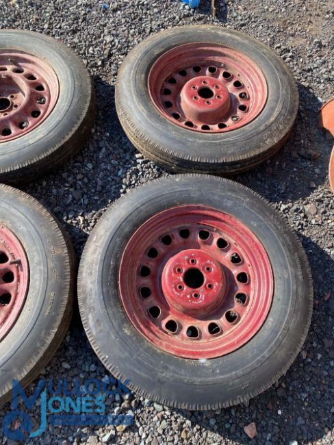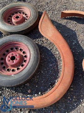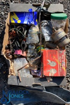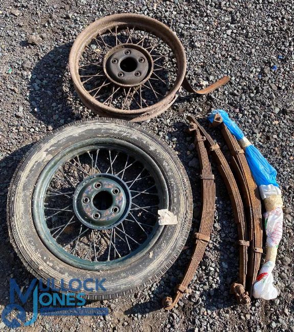 Vintage Jowell Classic Car Parts, various makers and models included Jowell Javelin parts, with noted parts of radiator, Lucas parts, Lucas King of the road chromed large lamp parts, windscreens, springs, steering wheels, axles, props, gear box, wheels - 2 are spoked wheels and a set of 4 with tyres a large lot in need of sorting. Please Note: Collection from Telford