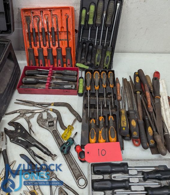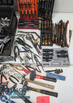 Assorted Hand Tools (Qty) includes various sizes of spanners and combination ratchets, assortment of grips, pliers, assorted screwdrivers and terminal tools, files, hammers, with a Milwaukee plastic tool box - 1x box 1x toolbox