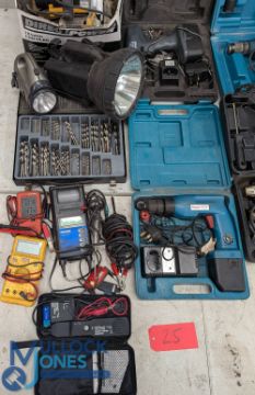 Power Tools (5) to include Direct Power 185mm circular saw, Makita hammer drill, 2x other drills, heat gun, case of drill bits, 2x torches, relay testers, empty Makita hard case - many with carry cases - 1x box 5x cases