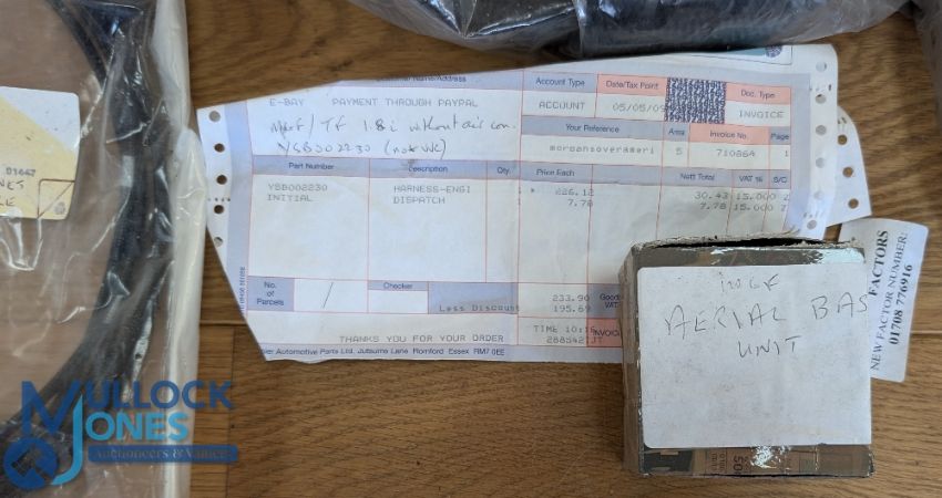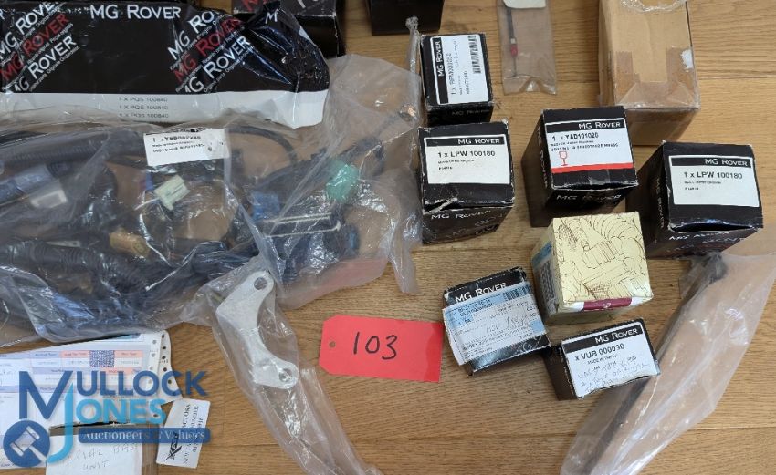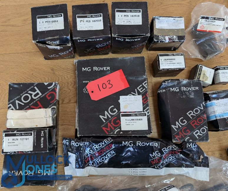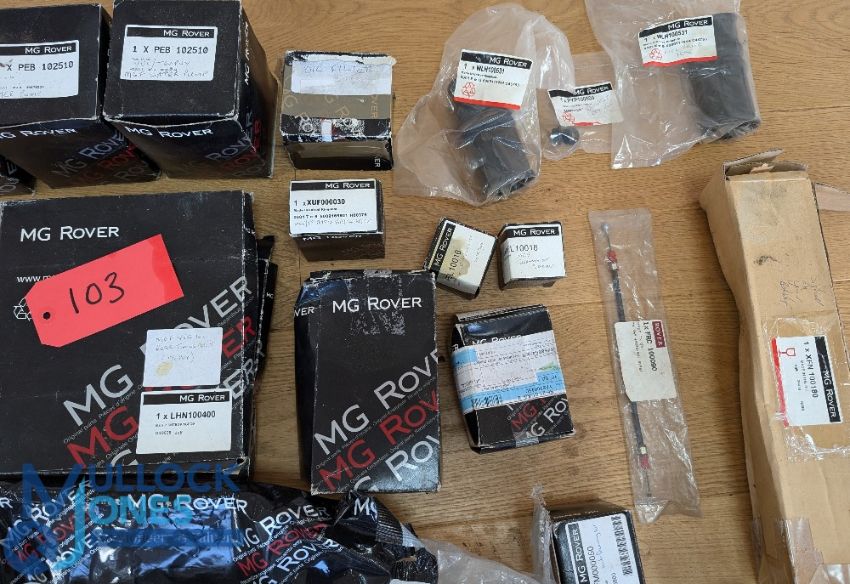 Automobile - MG Rover Parts - Water Pumps (x3), oil filter, thermostat, radio aerial base, bonnet release cable, engine harness loom, hoses, timing belt, fuel filter hose etc - see image - 1x box
