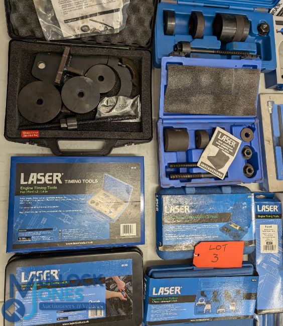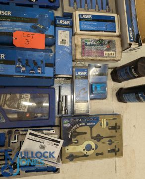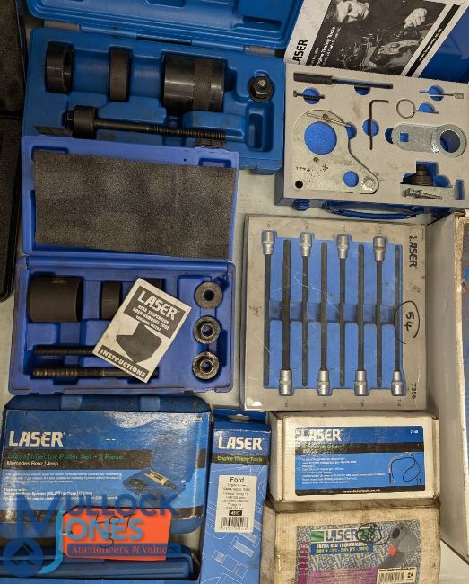 Automobile - Selection of 'Laser' Tools - to incl Rear Axle Beam Bush Kit (Vauxhall), Engine Timing Tools (Fiat/Ford), Engine Timing Tool Kit 2.0 chain dCi Engines, Impact Glow Plug Removal Kit ¼"D 9pc, Rear Suspension Bush Removal Tool (Vauxhall), Suspension Bush Puller, Ignition Coil Pullers 4 pc (VW / Audi), Diesel Injector Puller Set 3 pc (Merc / Jeep), star bit set 3/8"D 8pc, Emergency Wheel Nut Remover Set ½" D 4pc, Gas Soldering Kit, Ford Engine Timing Tools, Air Pencil Grinder 7149, Rack End Remover and installer, Timing Tools, Twin Camshaft Locking Tool (Vauxhall), Infra-Red Thermometer, Timing Tools etc, Diesel injector removal set, - mostly within cases (Qty) 2x boxes