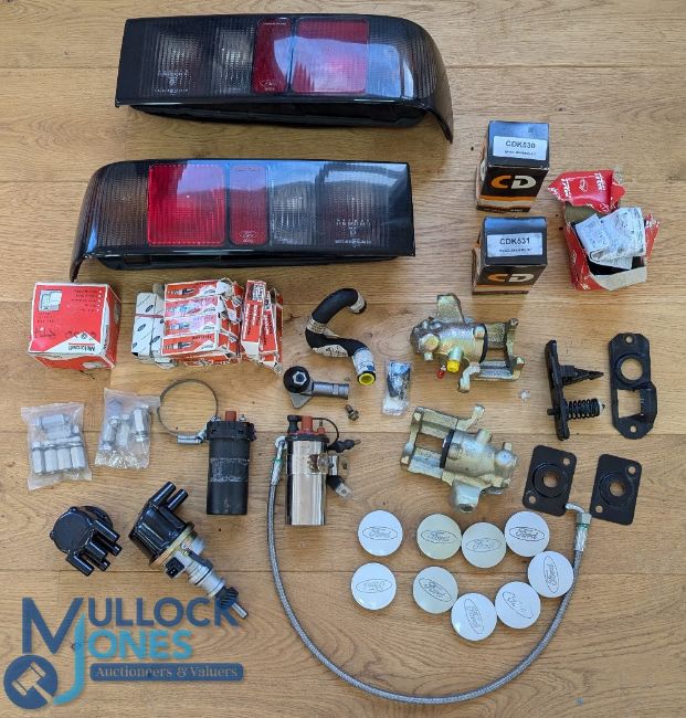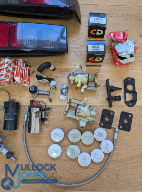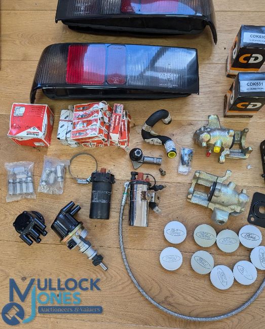 Automobile - Assorted Parts - Ford Cosworth rear lights, spark plugs, hoses, wheel bearings, brake caliper, coil, distributor, Ford Cosworth caps etc - see image 2x boxes