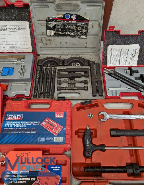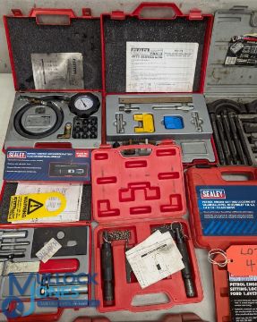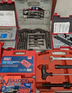 Automobile - Selection of 'Sealey' Tools to incl oil presser tester set 11pc, subframe alignment tool set, diesel and petrol engine locking setting kit 10pc, Quadmeter Automotive Analyser, 1000KG Capacity coil spring compressor wishbone suspension RE2281, gear puller set, petrol twin cam locking set (Fiat), petrol engine setting/locking kit (Vaux / Chevrolet) (Ford), Chaine drive, twin cam setting and locking tool set 13pc, Magnetic Camber castor, Shock Absorber tool kit 12pc (Fiat/Seat/Volvo), twin cam setting set (Renault) VS1220, Refractometer Antifreeze VS0052, Bluetooth battery tester, Multimeter, Magnetic camber castor Gauge, Lambda Sensor Tester/Simulator, Dial Gauge, locking kit VSE5976, engine flywheel locking tool - many with hard cases 2x boxes