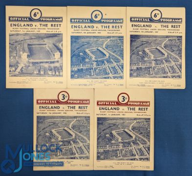 1955-59 England Rugby Final Trial Programmes (5): Still the pattern of pre-WW2 4pp cards, aerial Twickers pic, some marked but gen. G