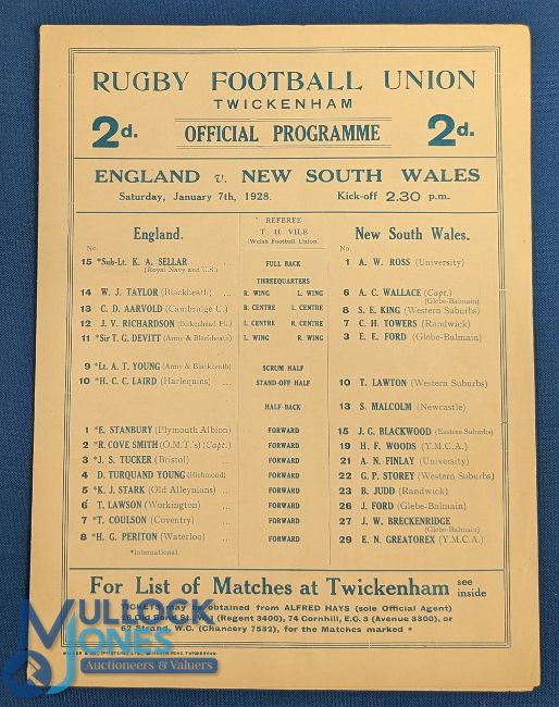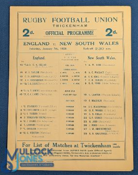1928 England v NSW Rugby Programme: Changed to portrait-format team page to front of 4pp foldover. VG indeed for the visit of the Waratahs