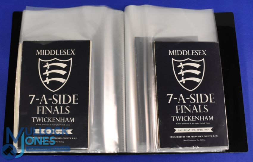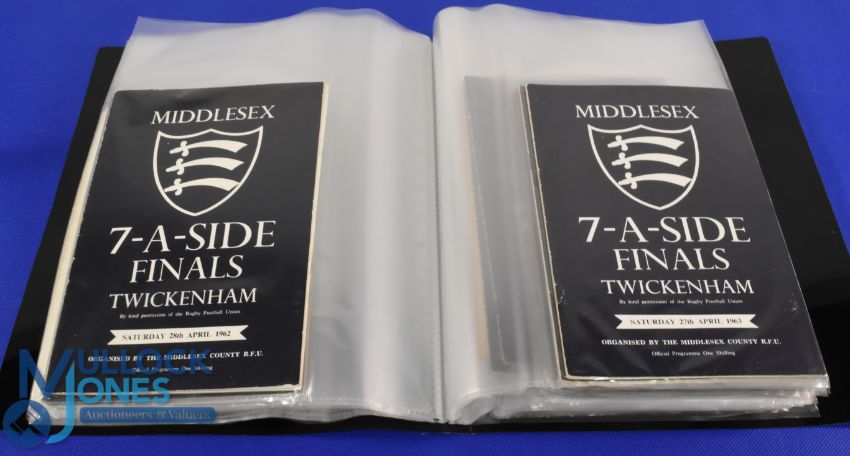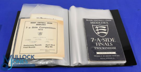 1952-1987 Inc, Middlesex Sevens Rugby Programmes (36+): Mostly with the famous, standard, navy-blue cover, this famously popular Twickers event across four decades collected here, and inc one for Prelim Rds, too, 1972. VG