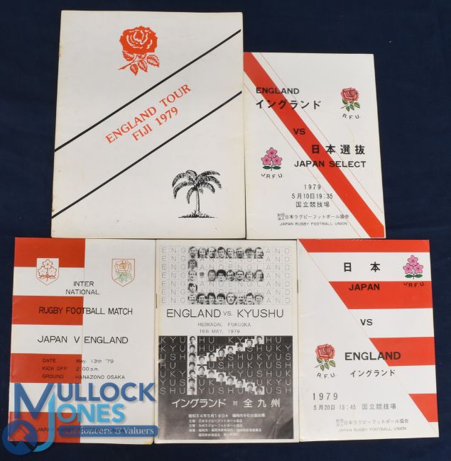 1979 England in Japan and Fiji Rugby Programmes (5): Marvellous & less-often found selection, v Japan in both tests, Japan Select & Kyushu and the Fiji tour issue. In splendid condition, not to be missed