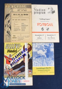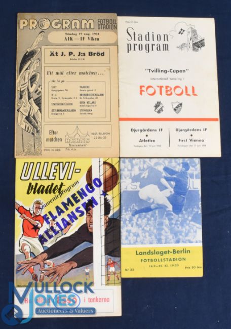 Selection of Sweden programmes 1951 AIK Stockholm v IF Viken, 1954 Djurgardens v First Vienna/Atletico Madrid double issue 15th & 17th June: 1963 Alliansen v Flamingo (Brazil) 8 May 1963, 1959 Landslaget v Berlin Select XI; fair/good. (4)