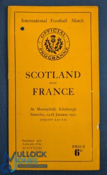 1950 Scotland v France Rugby Programme: One clean p/hole and, like a valuable Penny Black (?!), it had the centre teams page blank: they have been entered in ink. Otherwise VG