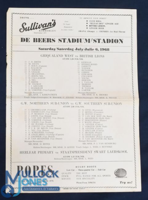 1968 British & I Lions Rugby Programme v Griquas: At Kimberley, 6/7/68. Single sheet local issue, rare. VG