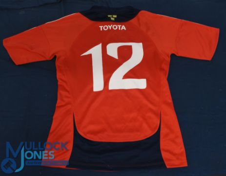 2007-9 Munster Match worn Rugby Jersey: Adidas, Toyota and Munster logos, red with blue and white trim, no.12 in white to rear, triple crowns to collar. Excellent