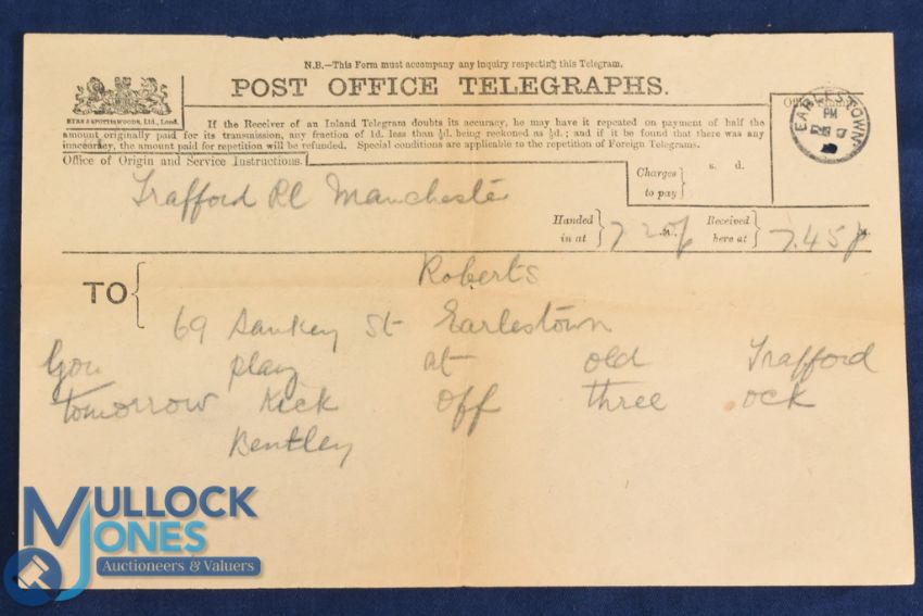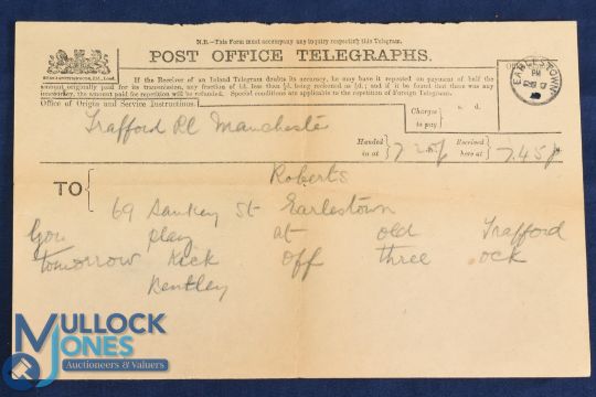 Pre-WW1 Manchester United Football Club Ltd Post Office telegraph to R Roberts: you are selected to play at Old Trafford tomorrow with 3.00 pm kick-off, this telegraph is timed at 7.45pm, date not clear a little obscured probably 1913; fair. (1)