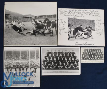 1949 NZ All Blacks Rugby Tour to S Africa Photos, One Signed (5): Large and small photographs of the '49 All Black squad; large press shot of a successful Bok kick v NZ in the 4-0 test series win; beautiful big 12" x 9" shot of Savage passing from a maul v Southern Universities; and a Brewis test try v NZ, mounted with signed messages on margins 'to Louis' from the scorer, plus Cecil Moss & Ryk van Schoor. Super!