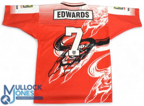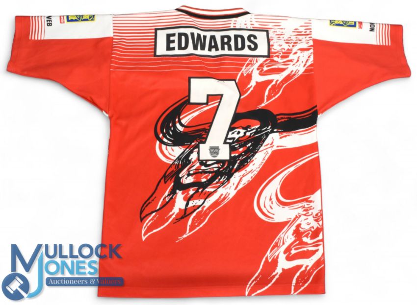 Shaun Edwards Named Match worn Wigan R Lge Jersey/Pic (2): Modern red and white patterned short-sleeved no.10 jersey, fully badged and logoed for Stones Super League, Sky Sports and Norweb, plus 'Edwards' to rear. Plus 6" x 4" colour pic of a young Shaun c.2000 - with curly hair! VG