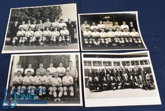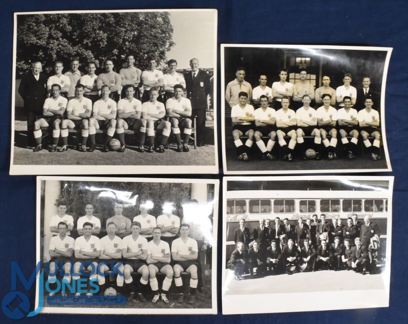 1956 The England FA XI Tour of South Africa 8" x 6" black & white photographs featuring the football team in full playing kit x 3 different plus a further photograph of the entire squad (players/officials) in blazers/neckties prior to travelling; good. (4)