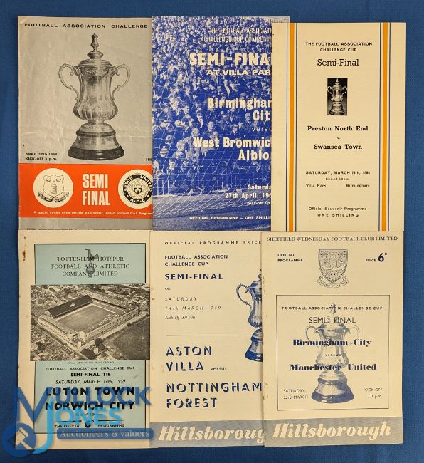Collection of FAC semi/final match programmes 1956/57 Manchester Utd v Birmingham City, 1958/59 Aston Villa v Nottingham Forest, 1958/59 Norwich City v Luton Town, 1963/64 Swansea Town v Preston NE, 1967/68 Birmingham City v WBA, 1967/68 Leeds Utd v Everton; fair. (6)