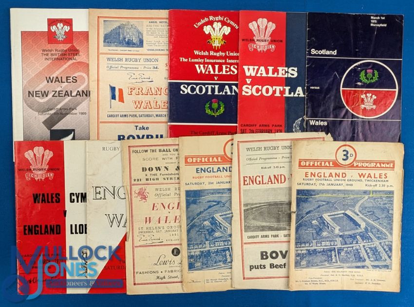 1948 on Wales Rugby Programme Bundle (11): Matches v England h and a 1948-51 inc, 76 & 77; with Scotland 1975, 76 & 88; v France 1950 (Grand Slam) & v NZ 1989. Bargain? Some poor, some VG