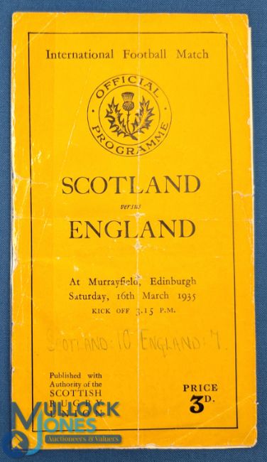1935 Scotland v England Rugby Programme: Same traditional slim orange Scots issue from Murrayfield, with some signs of wear