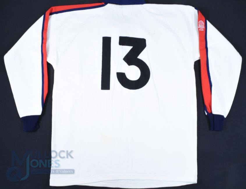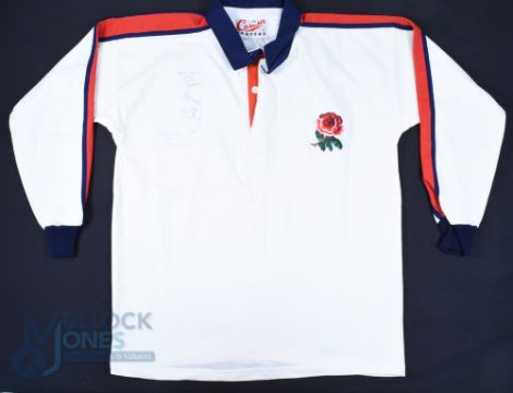1994-5 England (Will Carling's?) Signed England Rugby Jersey: Match worn Cotton Traders 44" white jersey, red/navy stripes and rose to long sleeves as well as breast, black stitched 13 to rear. Inscribed in ink 'England Grand Slam Captains' and signed neatly by Will Carling and Bill Beaumont. Excellent