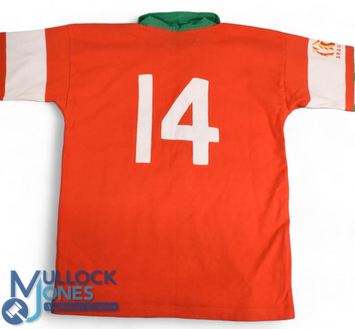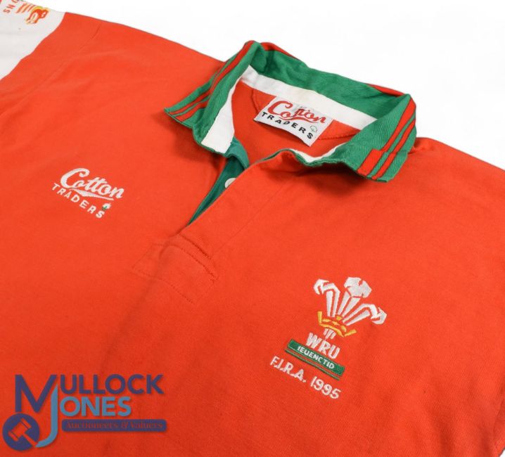 1995 Wales Youth FIRA Cup Match worn Rugby Jersey: Crisp bright distinctive red Cotton Traders design & make with green/white trim, size 42", white no.14 stitched to reverse, from the 'Junior World Cup'. Excellent
