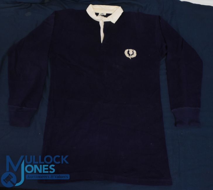 1988 Norrie Rowan's Match worn Scotland Rugby Jersey: The prop's classic dark blue jersey with white thistle badge, white 3 to rear. Umbro make, XL. From the year of the last of his 13 Scottish caps. VG