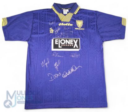 1997/98 Wimbledon Multi-Signed home football shirt in blue, Lotto/Elonex, short sleeve, size L, embroidered 'The Crazy Gang', 11x signatures to front in ink. Shirt donated by the Club with Proceeds donated to the Derbyshire Fire & Rescue