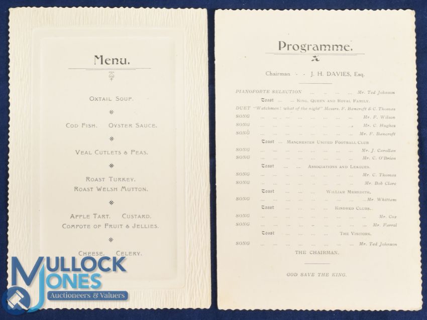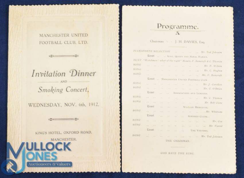 1912 Manchester United Football Club Limited Invitation Dinner & Smoking concert menu and programme with Toasts to Manchester United (the club), Leagues, Kindred Clubs, The Visitors and WILLIAM MEREDITH for whom the evening was arranged to assist his benefit year income; held at King's Hotel, Oxford Road, Manchester 6 November 1912; in two parts, overall good. (1) Note: The invitation (only) card was sold in our previous auction August 2024