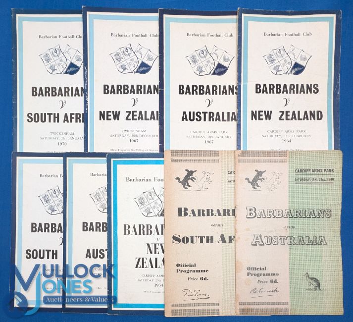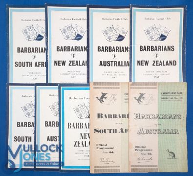 1947-70 Barbarians v Major Tourists Rugby Programmes (9): Great selection, v Australia 1947, 1958 and 1967; v NZ 1954, 1964 and 1967; and v S Africa 1951, 1961 and 1970. Famous games and names! Gen G or better