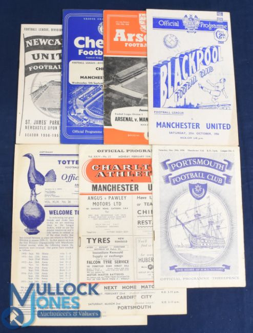 1956/57 Manchester Utd away match programmes v Newcastle Utd, Chelsea, Arsenal, Blackpool, Charlton Athletic, Portsmouth, Spurs; fair. (7)