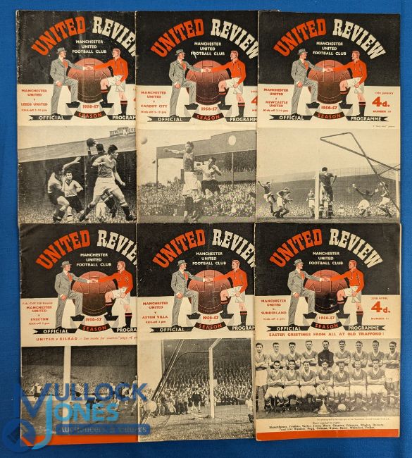 1956/57 Manchester Utd home league match programmes Sunderland, Aston Villa, Everton (FAC), Newcastle Utd, Cardiff City, Leeds Utd; fair, tokens intact (6)