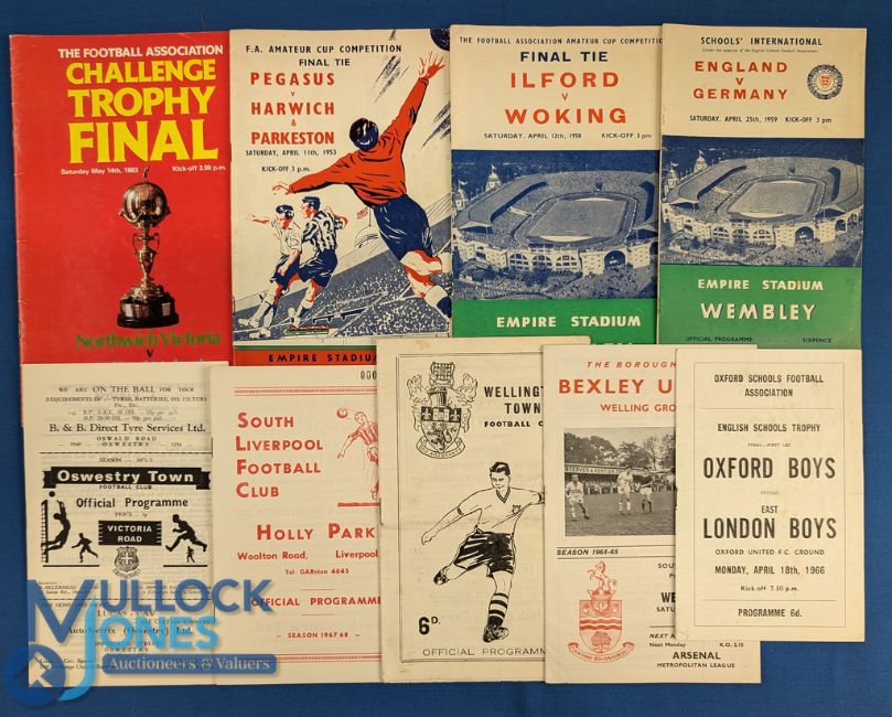 Selection of non-league match programmes 1953 FAAC final Pegasus v Harwich & Parkeston at Wembley, 1958 FAAC final Ilford v Woking at Wembley, 1959 England v Scotland schools at Wembley, 1964/65 Bexley Utd v Wellington Town, 1964/65 Wellington Town v Chelmsford City, 1966 ESFA Cup final Oxford Boys v East London Boys at Oxford Utd, 1967/68 South Liverpool v St Helens Town, 1971/72 Oswestry Town v Sandbach Ramblers (Cheshire League), 1983 Challenge Trophy final Telford Utd, v Northwich Victoria at Wembley; fair. (9)