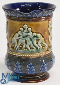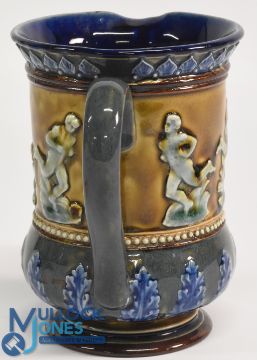 Victorian Royal Doulton Ceramic Rugby Jug: Classic design with several colours and with rugby players in raised relief. VG