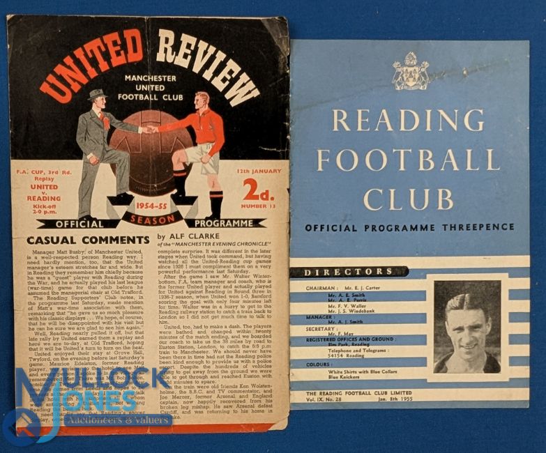 1954/55 Reading v Manchester Utd FAC 3rd round programme 8 January 1955 (fair); Manchester Utd v Reading FAC 3rd round replay 4 page programme (small edge tear, corner tear with small paper loss, no writing) (2)