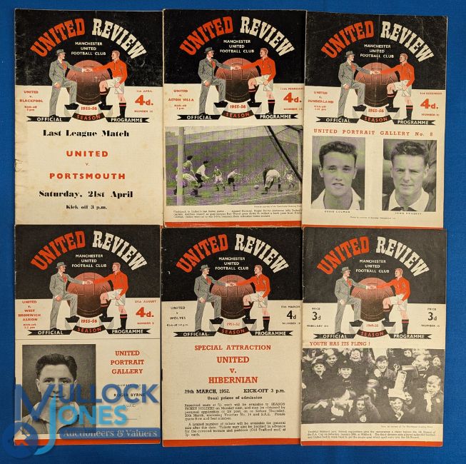 Selection of Manchester Utd home programmes, 1949/50 Burnley, 1951/52 Wolves, 1955/56 WBA, Sunderland, Aston Villa, Blackpool (championship decider); fair. (6)