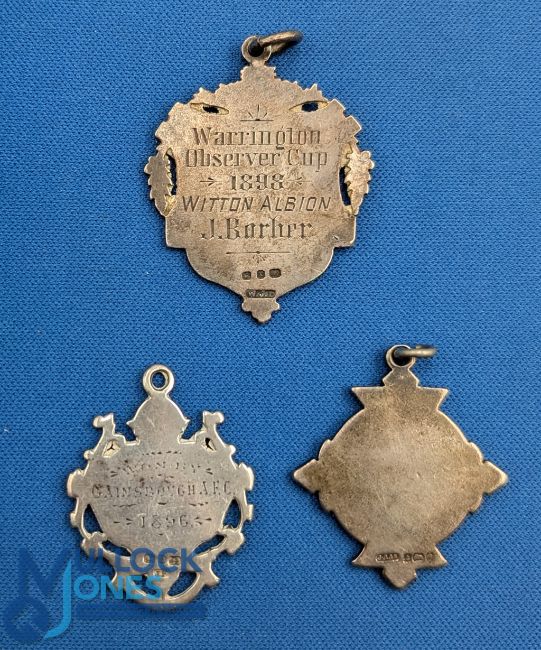 Three Silver Football Fobs: 1898 Whitton Albion Warrington Observer Cup - J Barber winners hallmarked silver medal with a gold shield, an 1896 Gainsborough AFC winners medal hallmarked silver, and an Indian Bombay Harwood league medal 1904 (now Mumbai football league). Three interesting medals 43g