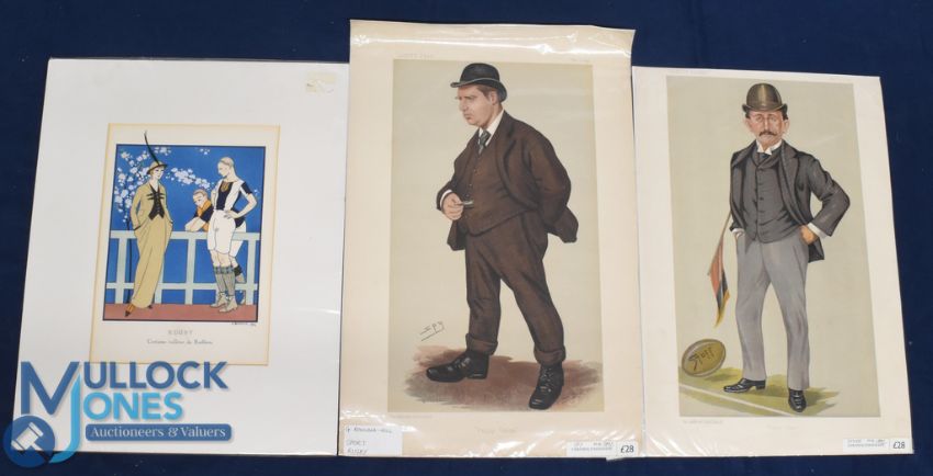 1890-1914 Vintage Rugby Prints (3): The famous Vanity Fair caricature full length colour portraits of G Rowland Hill and E Temple Gurdon, 1892 and 1890, plus the stylish mounted French 'Rugby: Fashion', art nouveau coloured advertising piece. VG