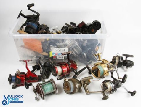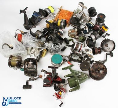 Large selection of assorted reels and parts for spares and repairs: including fixed spool, multiplier and fly reels, inc Abu, Silstar, Daiwa and others, all with faults, losses, breaks etc, with a selection of assorted spools and loose parts (Box)