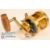 Rare Gladiator Mini Big Game Tournament fishing reel, made in Italy, 3 1/4" diameter, 3" across frame, lever drag, backplate tension adjuster, front plate adjuster, removable wooden handle, light use, complete with handbook, in maker's leather box with carry strap