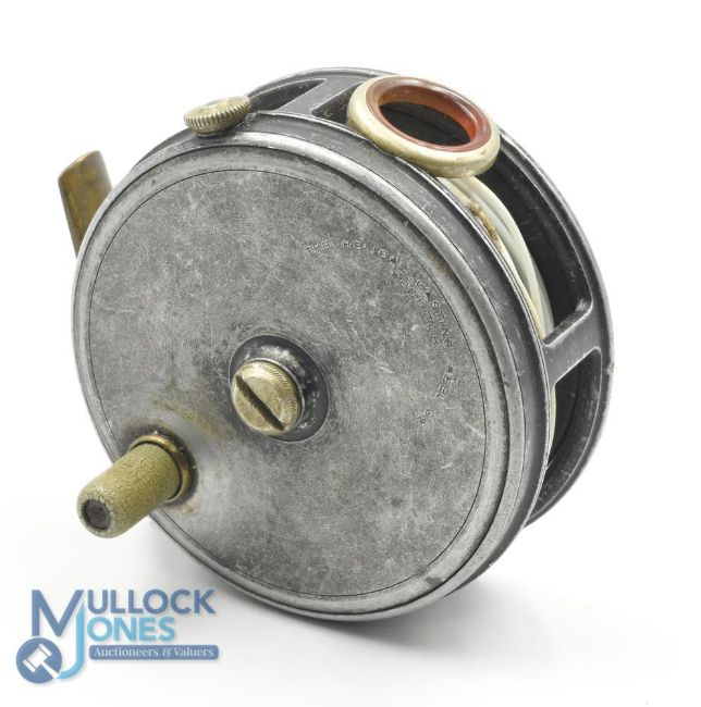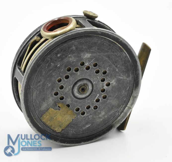 The Helical Casting Reel Co, Redditch, alloy trout fly reel, 3 1/2" ventilated spool, xylonite handle, milled rim tensioner, red agate line guide, some play and crack in back rim