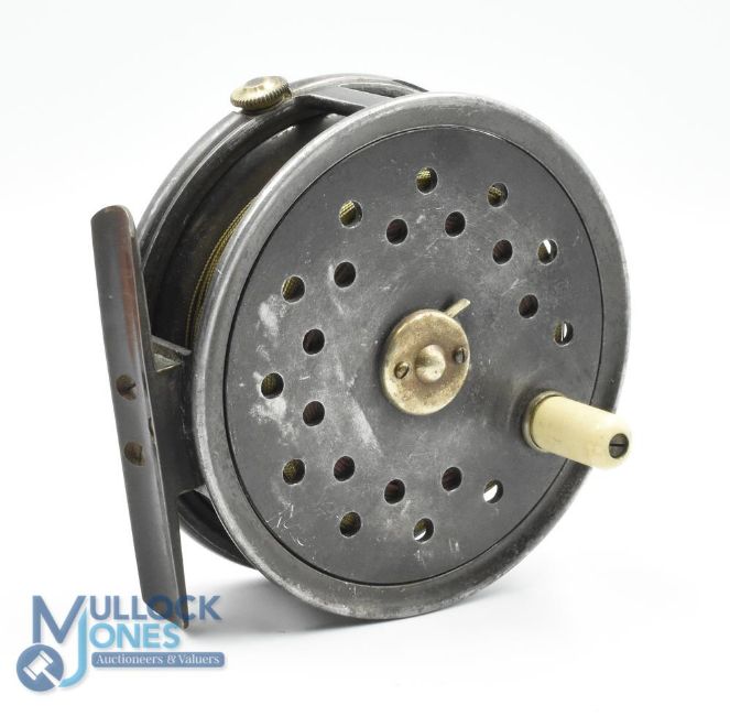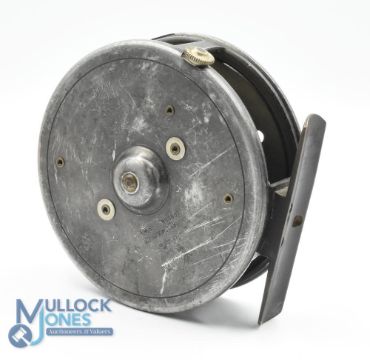 Farlow & Son Ltd, London SW1 "The Super Grenaby" alloy sea trout/light salmon fly reel, 3 7/8" ventilated spool, 2 screw latch, white handle, milled rim tensioner, constant check, runs very well, signs of use