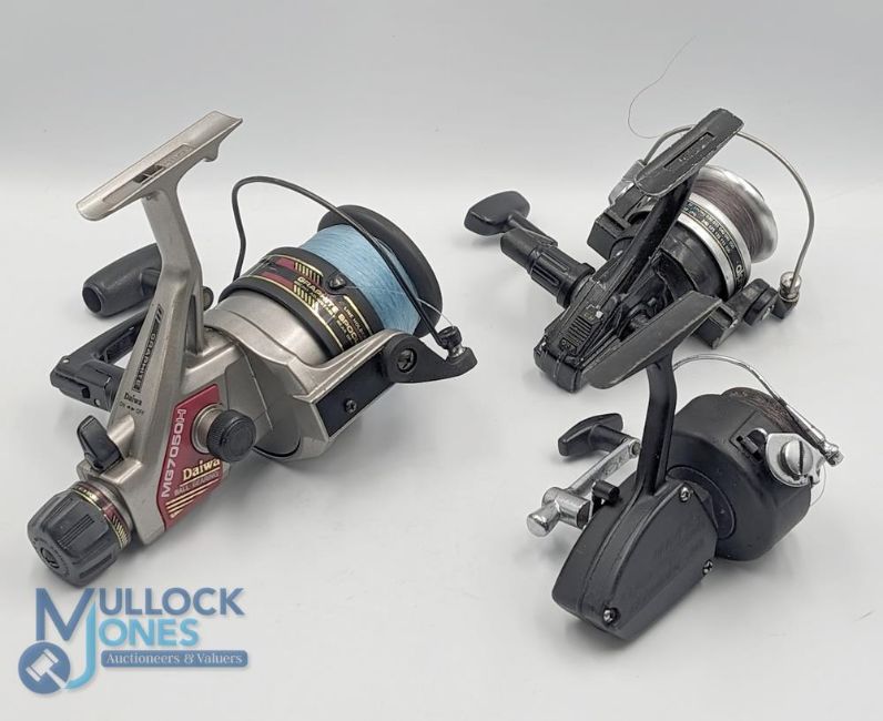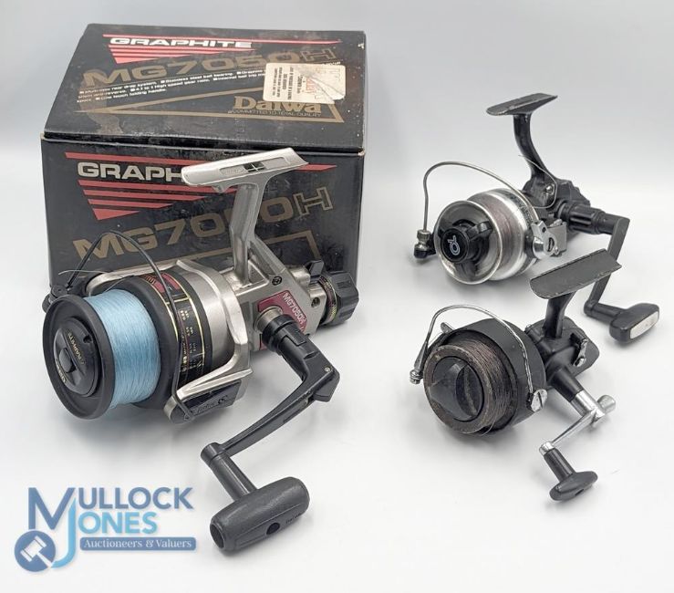 Daiwa MG 7050 H large graphite fixed spool reel, good bail, rear tensioner, original box with instructions, runs well; Shakespeare Alpha 050 2100 series fixed spool reel, good bail, runs well, no box; Shakespeare Standard 2012 fixed spool reel LHW, good bail, runs well (3)