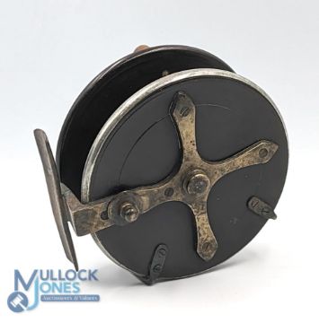 Ebonite/brass Slater pattern starback 4" diameter reel, twin horn handles, nickel silver back rim, binding, aluminium flange, brass drum core, optional ratchet check, good example